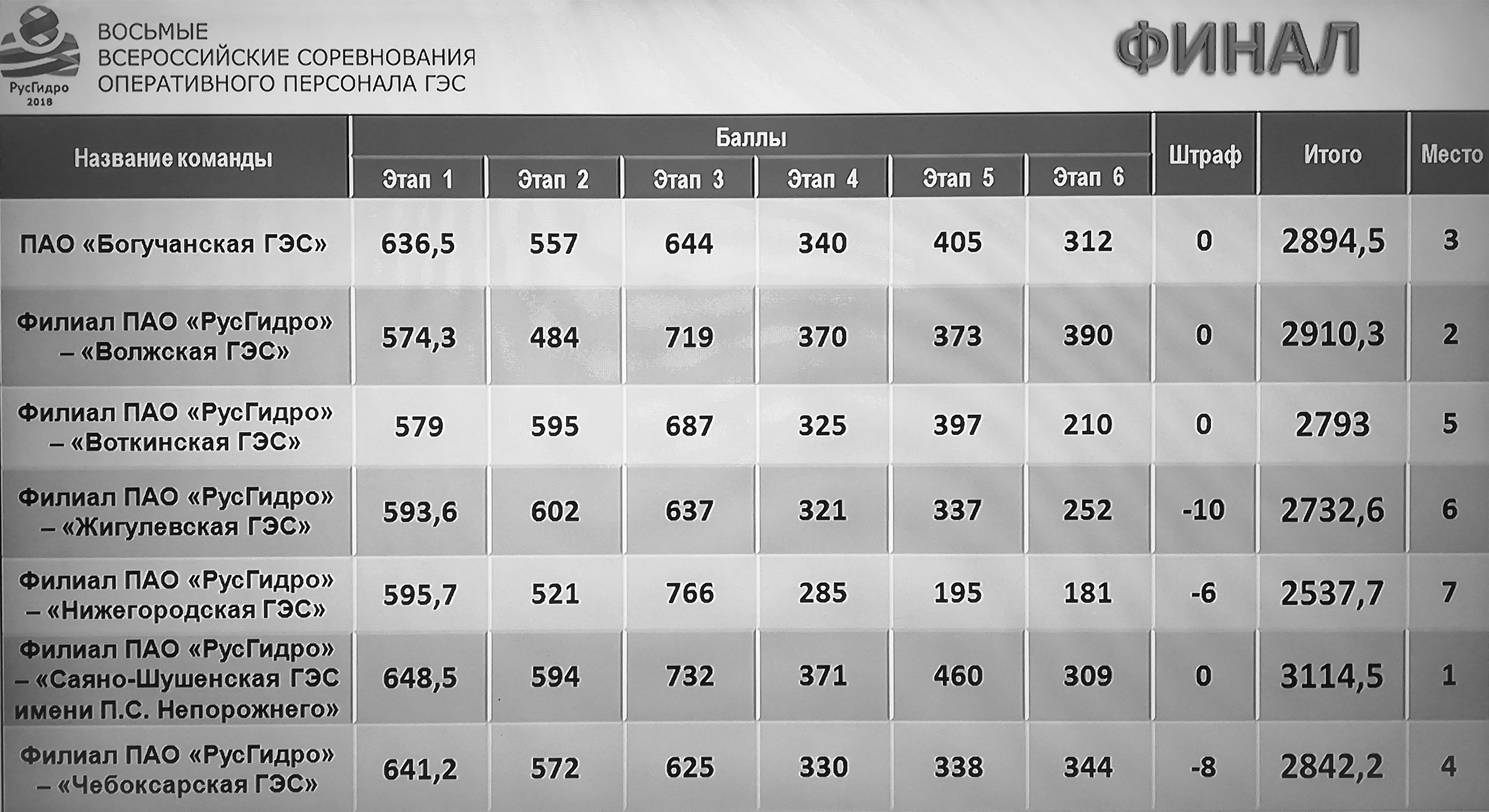 Победителем соревнований в командном турнире с наибольшим количеством набранных баллов стала команда Саяно-Шушенской ГЭС им. П.С. Непорожнего. На втором месте – оперативники Волжской ГЭС, третью строчку турнирной таблицы заняла команда Богучанской ГЭС.
