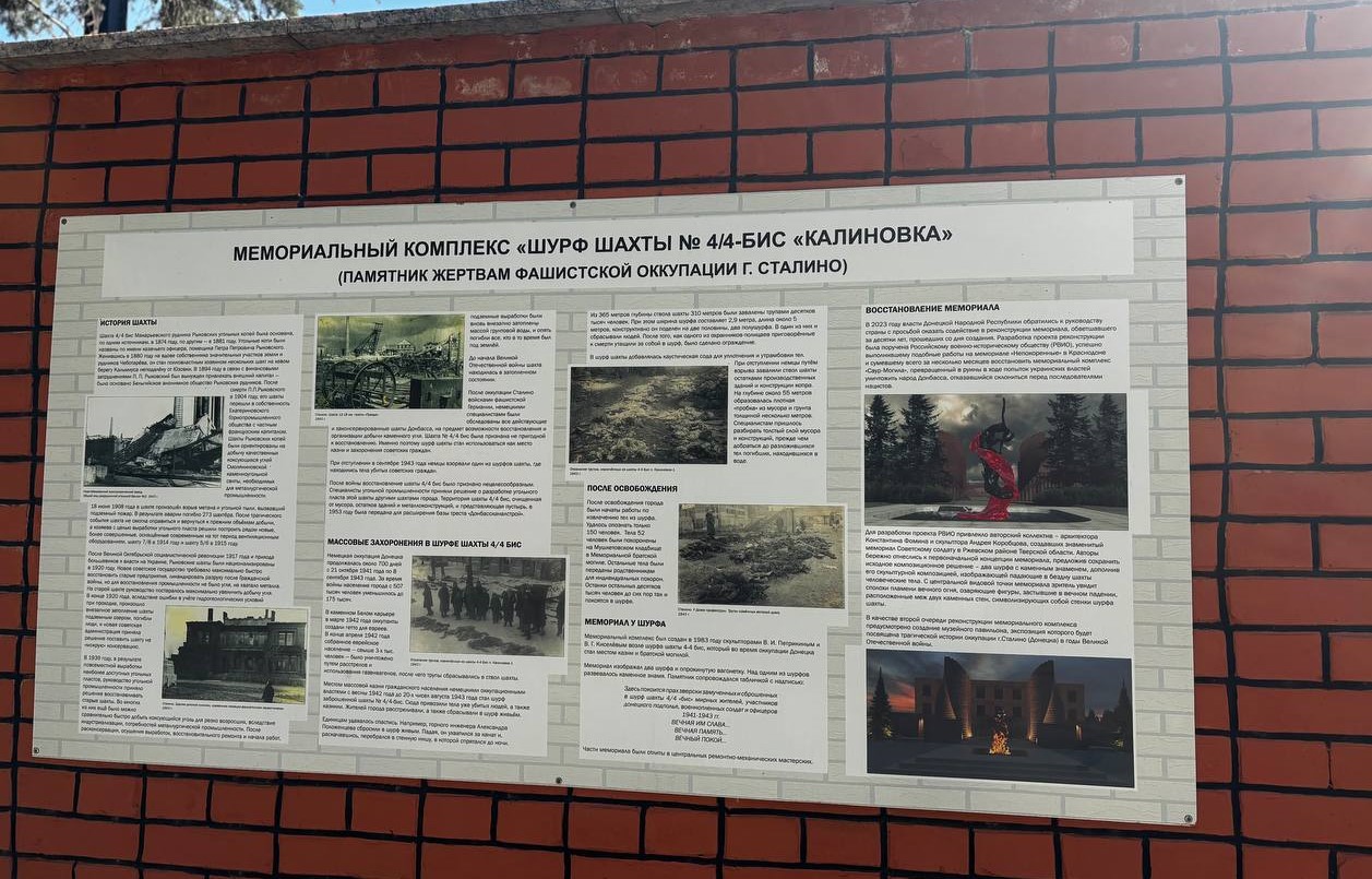 Шурф шахты № 4/4-бис в Калининском районе Донецка, стал местом массовой казни гражданского населения немецкими оккупационными властями во время Второй мировой войны. Это второе по массовости место захоронения жертв фашизма после Бабьего Яра. Здесь были сброшены тела 75-100 тысяч человек. Мы помним вас, герои, освободители Донбасса.