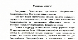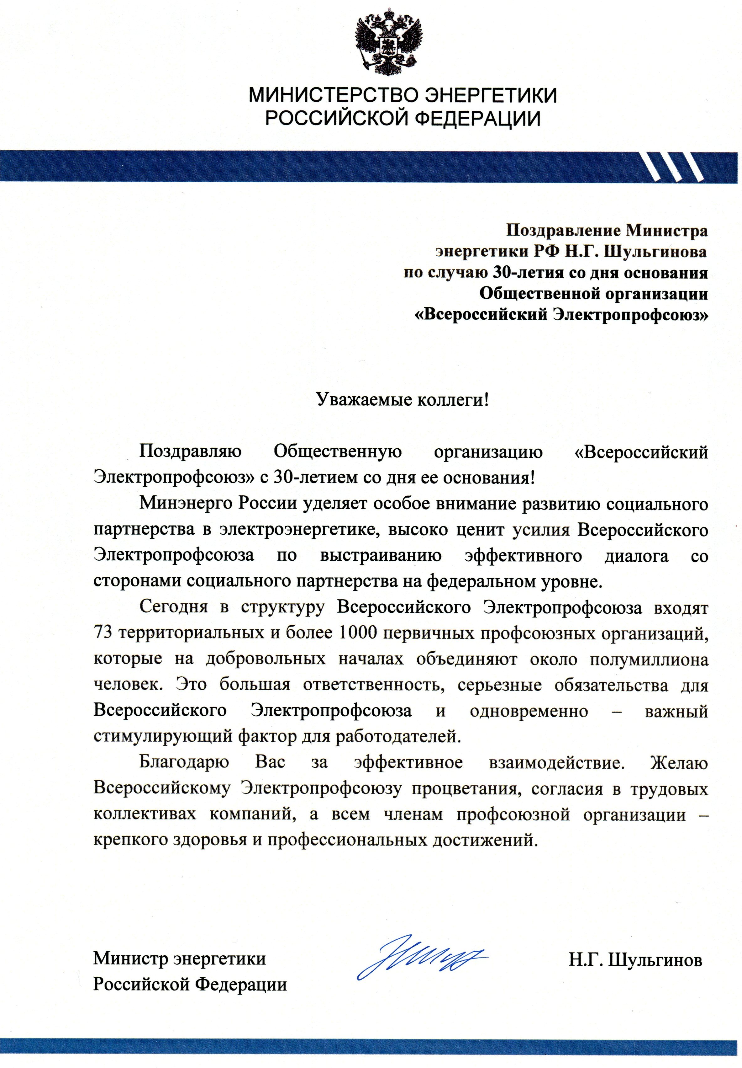Министр энергетики Российской Федерации Н.Г. Шульгинов в канун профессионального праздника – Дня энергетика – поздравил Общественную организацию «Всероссийский Электропрофсоюз» с 30-летием со дня образования.