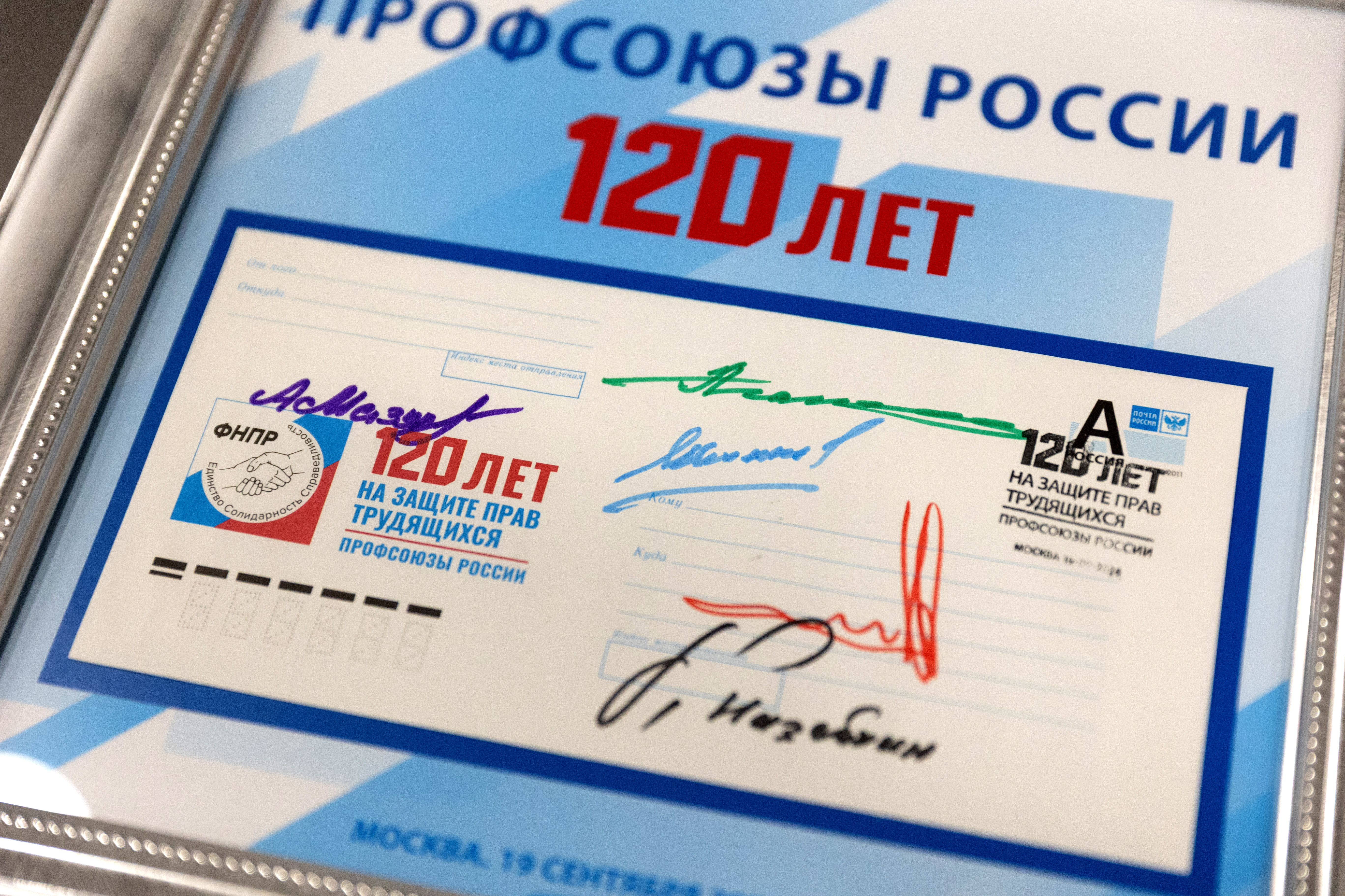 В рамках торжественных мероприятий состоялась церемония памятного гашения художественного маркированного конверта, посвященного российским профсоюзам. На конверте изображен логотип Федерации, тираж составил 500 тысяч экземпляров.