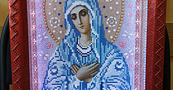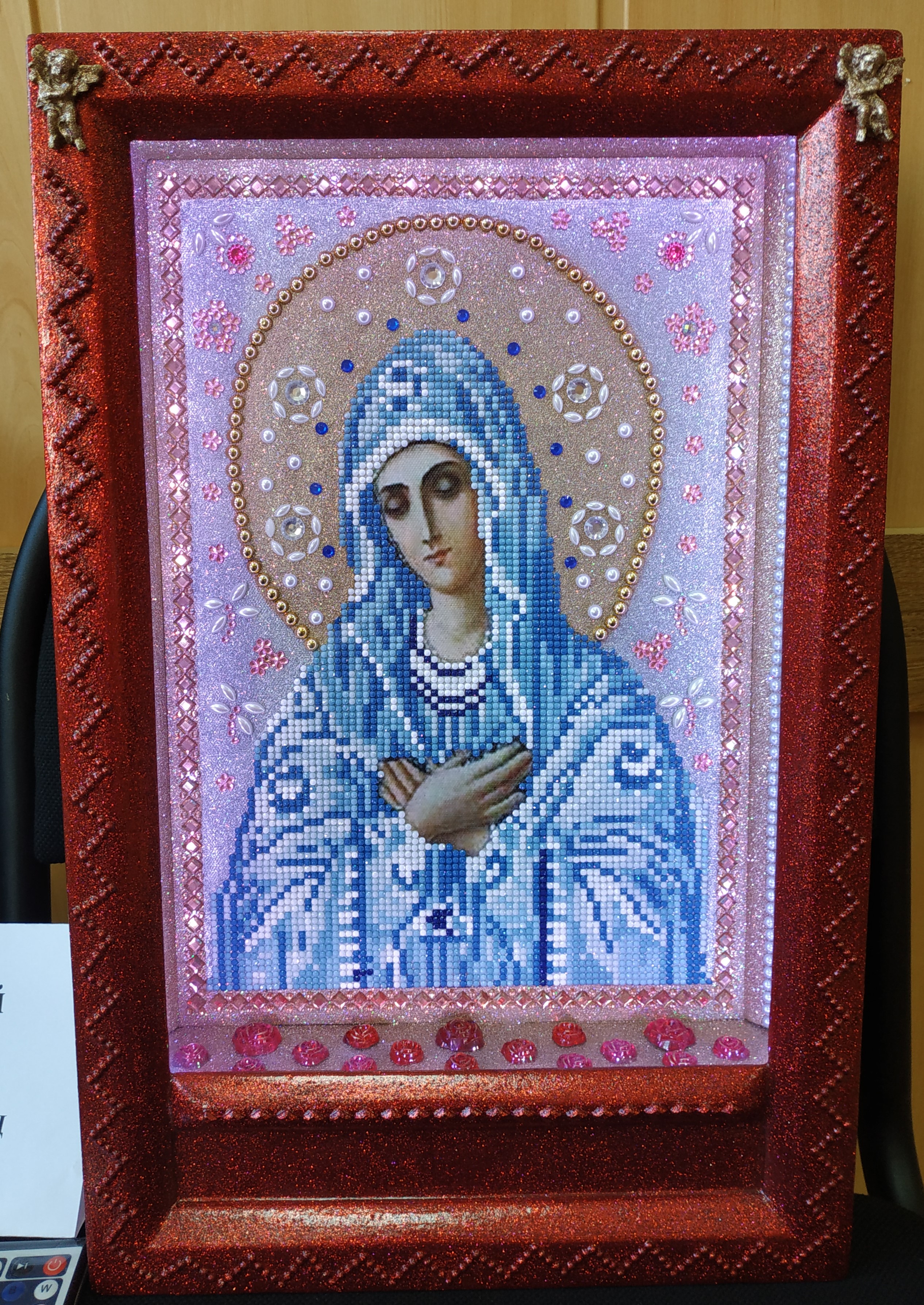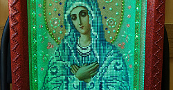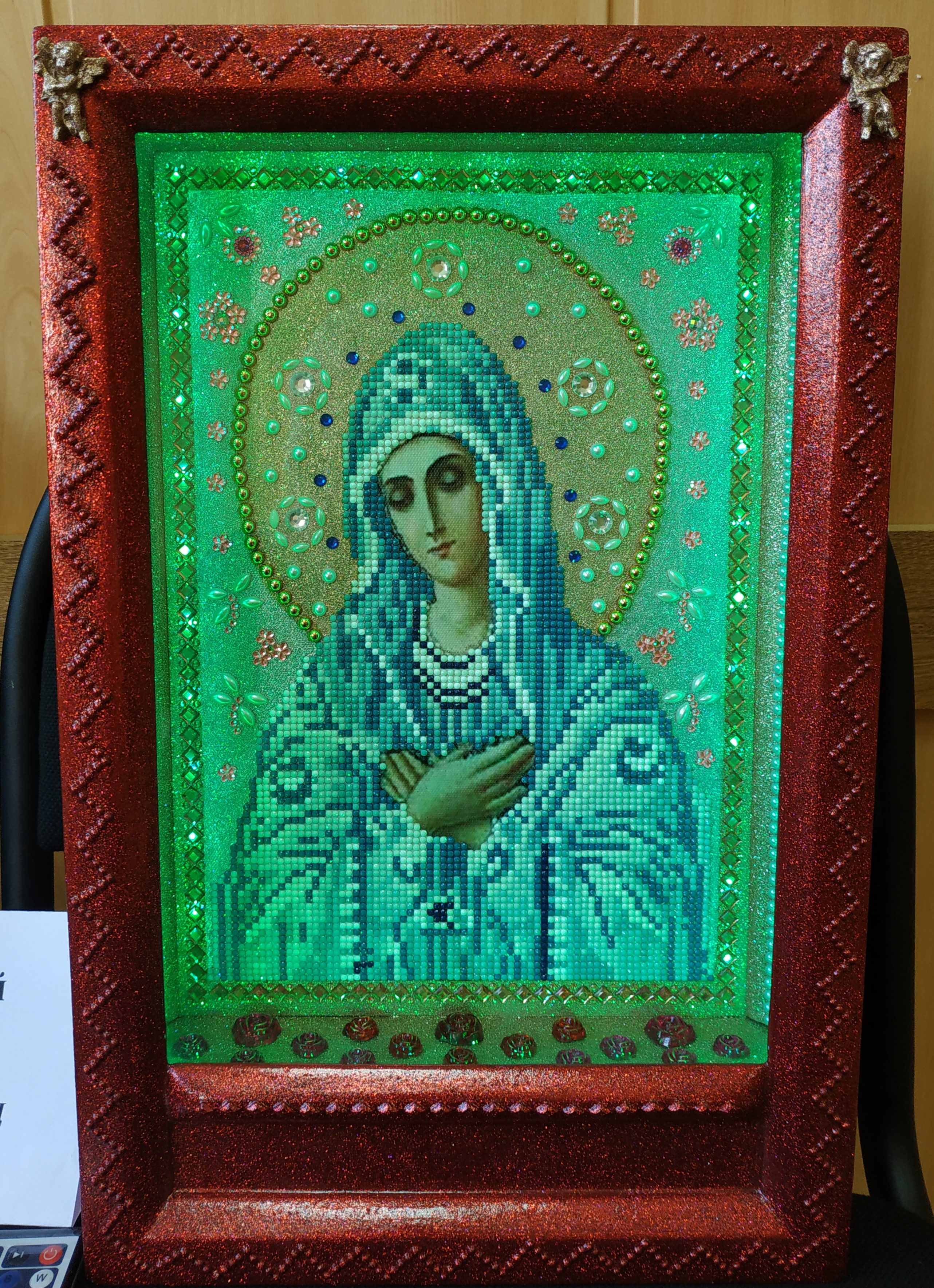 · икона с образом Богородицы, расшитая разноцветными стразами и блёстками, со встроенной подсветкой из светодиодов, что придаёт ей особую таинственность.