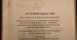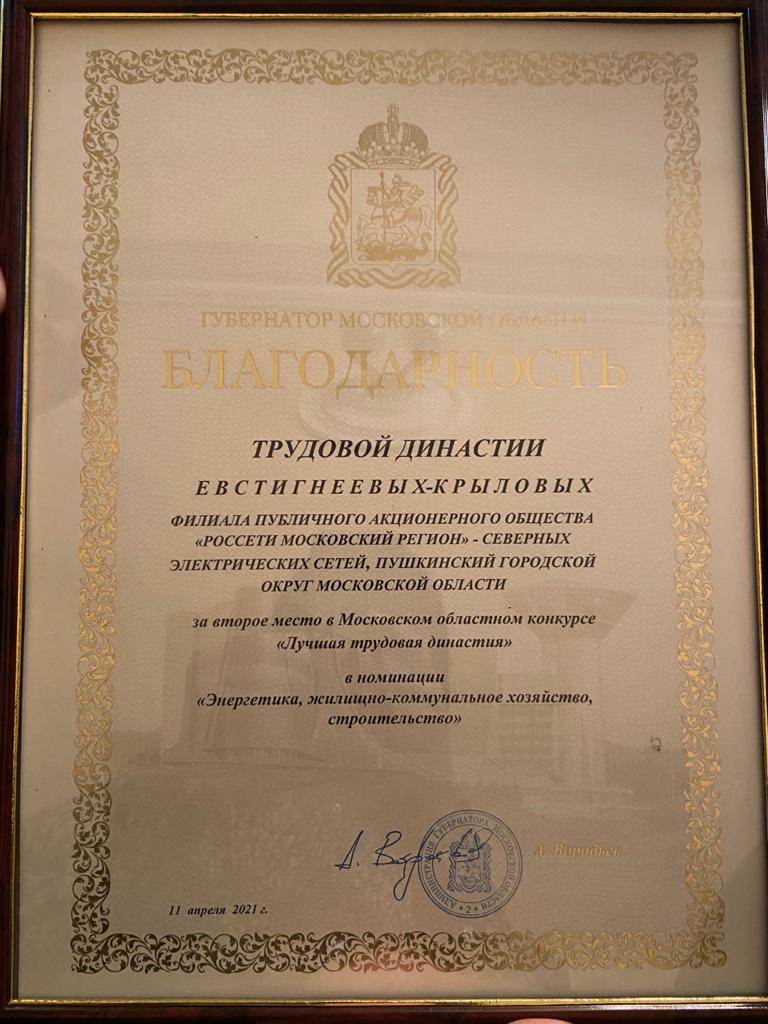 Губернатор Московской области Андрей Воробьев 16 апреля 2021 года объявил благодарность трудовой династии Евстигнеевых-Крыловых из Северных электрических сетей за второе место в Московском областном конкурсе «Лучшая трудовая династия» в номинации «Энергетика, жилищно-коммунальное хозяйство, строительство».