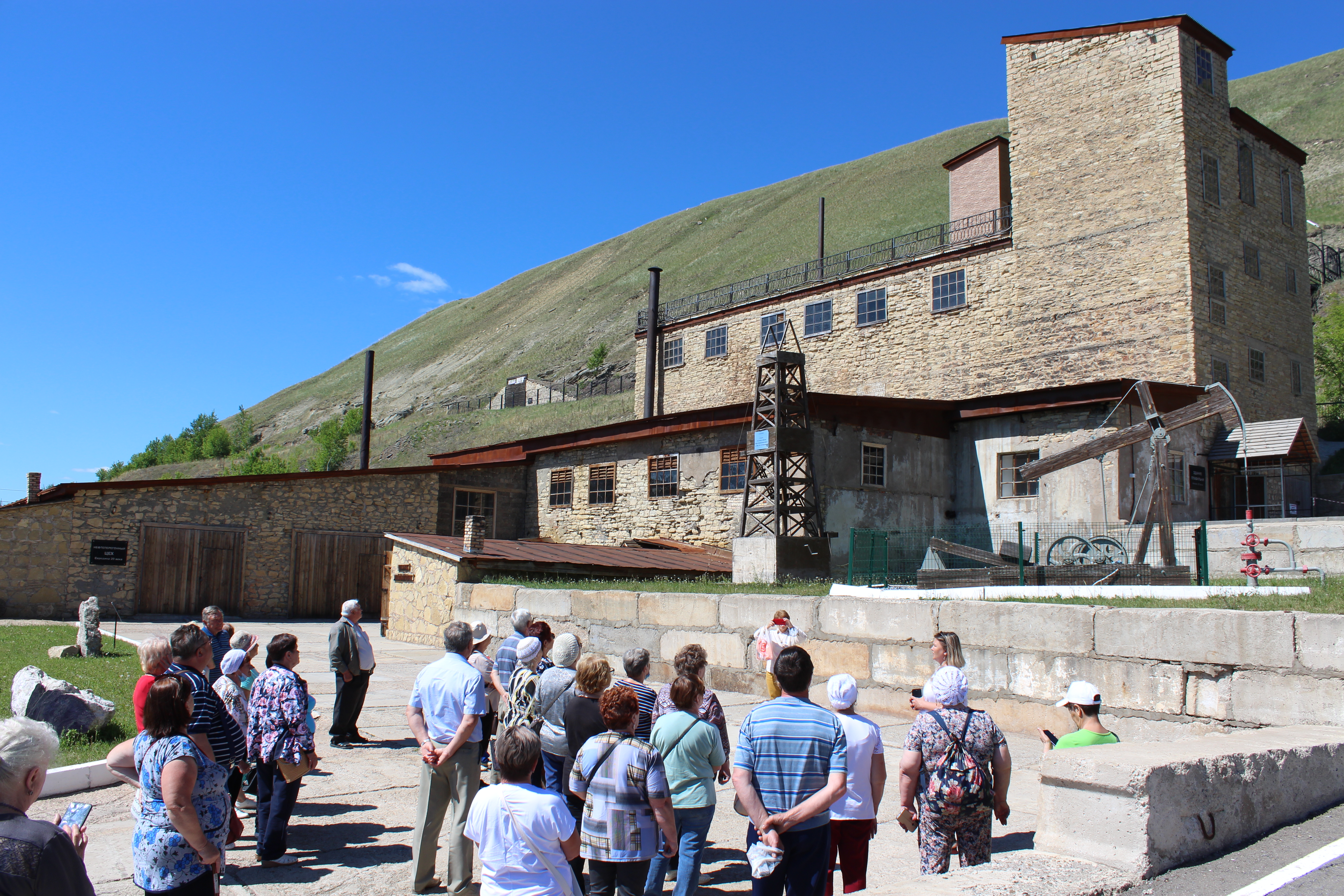 Впереди была самая интересная часть нашей экскурсии – здание плавильни и вид на сам завод. Если в самом начале добычи битума, во времена Ласло Шандора, этап варки происходил на берегу реки, годы спустя котлы открытого типа перенесли и поставили здесь. Топили опять же дровами. Вентиляцией служили отверстия на потолке, двери и окна. Рабочие, среди которых были в основном женщины, в таком дыму не видели даже друг друга. Далее пенсионеры увидели павильоны кузнечного дела, экспонатов ремесленных рабочих инструментов и макеты для бурения скважин, и переработки битума.