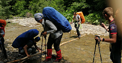 А дальше… А дальше, собственно говоря, начался первый подъем в горы с непереводимой игрой слов всего отряда. Погода в горах менялась несколько раз за один день. Под дождем скользило все – глина под ногами (и кто сказал, что грязь больше 1см не накапливается, а отваливается?), листья, камни, стволы деревьев, за которые хотелось ухватиться. Руководитель группы сразу дал понять, что вопрос «сколько нам осталось до лагеря» более чем не уместен, поскольку отвечал неизменно «где-то 2,5км». «Где-то 2,5 км» продолжалось шесть часов пешего хода по тропинке, которая изобиловала лужами, канавами, глубокими колеями, а также многочисленными бродами через мелкие речушки. Но участники похода стойко перенесли все погодные казусы и другие сложности мокрого и холодного пути.