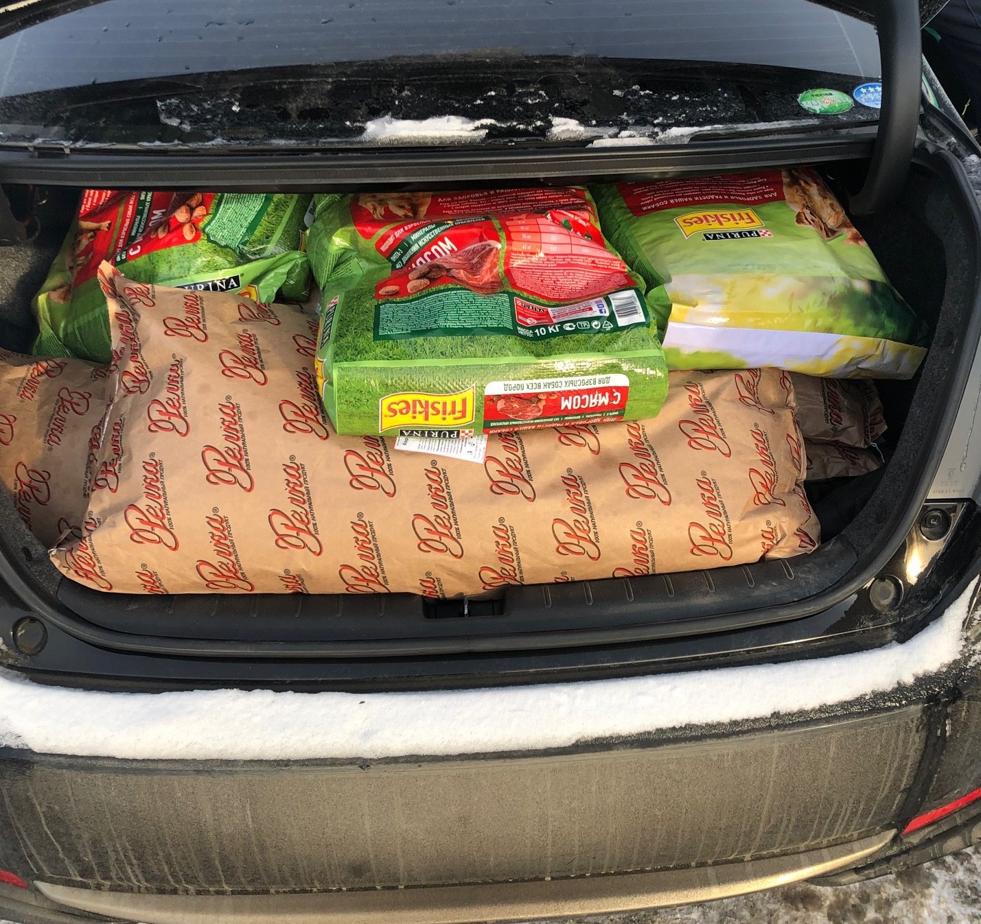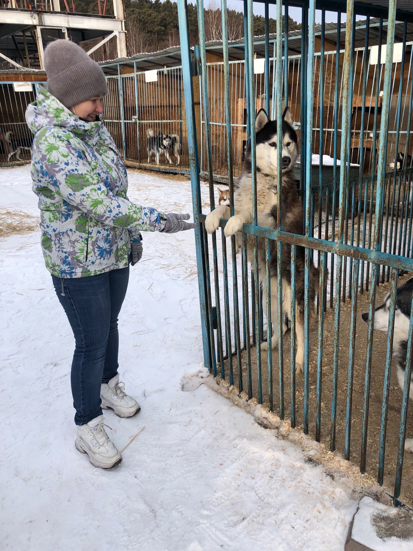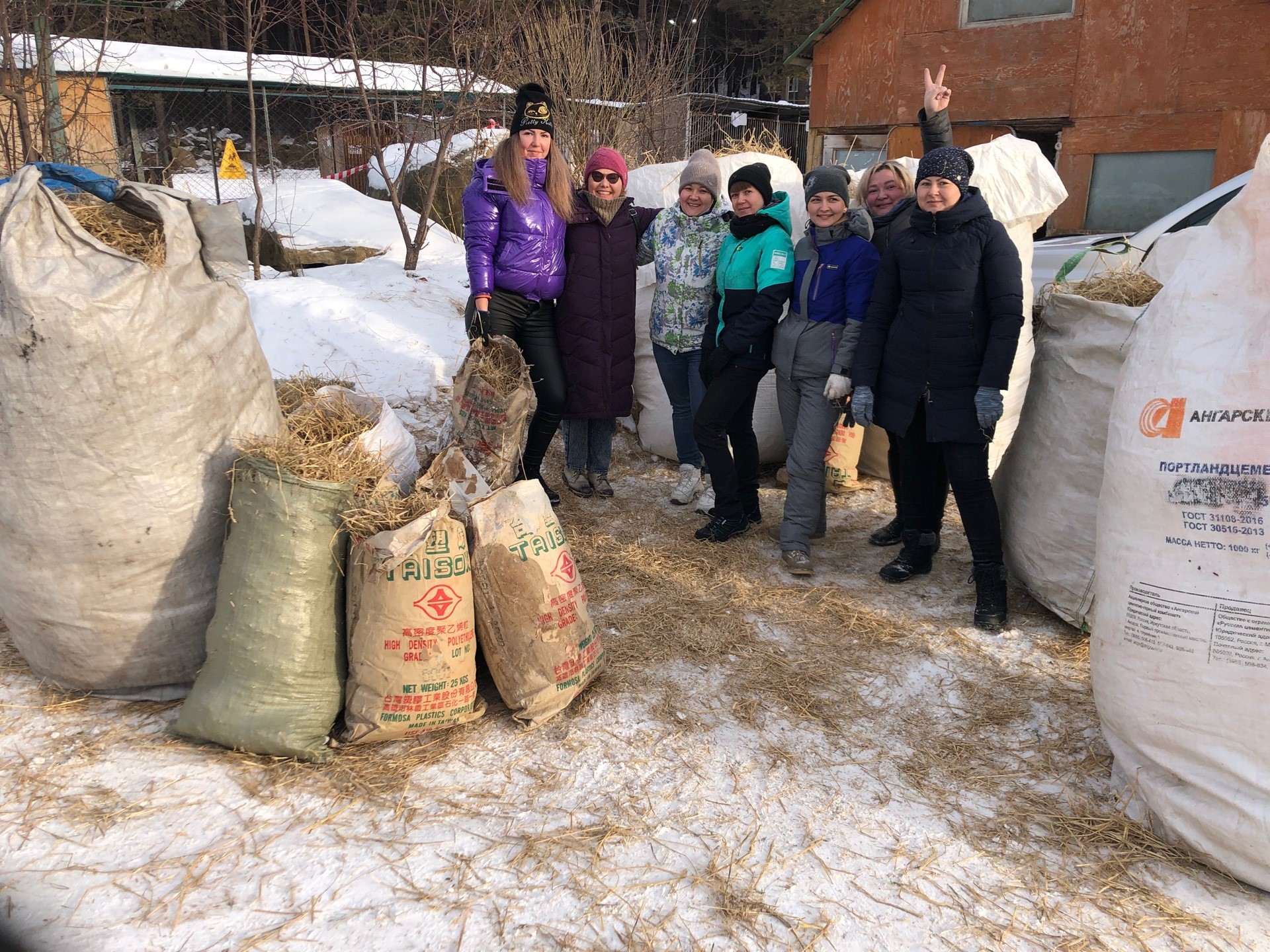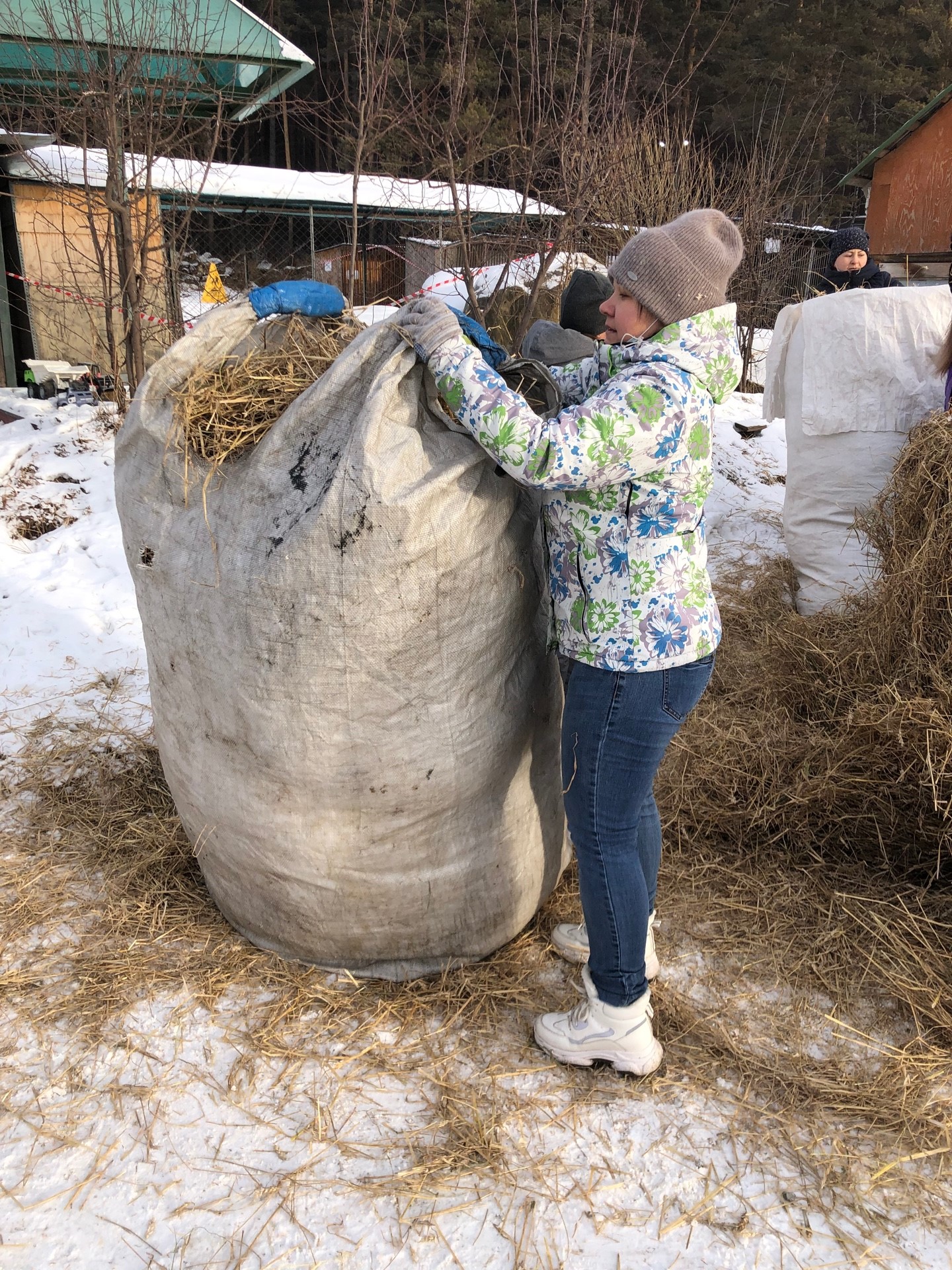 Корм. С прошлого года мы ездим в питомник К-9 уже не в качестве посетителей, а в качестве волонтёров. Вот и в этот раз мы помогали питомнику руками – складывали опилки и сено в мешки, резали утеплитель для вольеров, насыпали собакам снег. Еще мы устроили небольшую самостоятельную экскурсию – сходили во дворик хаски, их разрешают гладить и подходить вплотную к вольерам, т.к. собаки общительные и привычные к людям, катают желающих в упряжках.