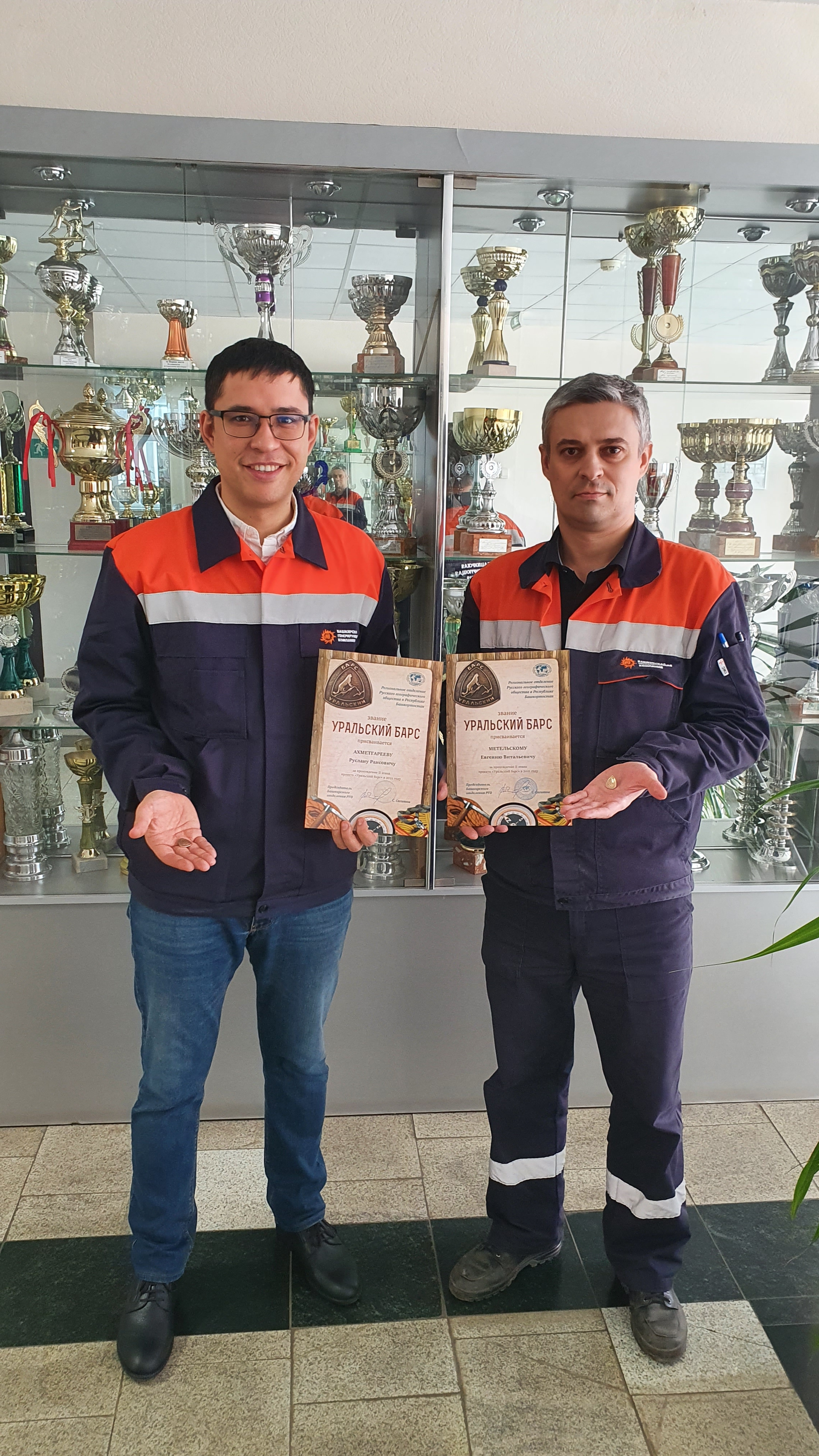 На днях наши коллеги посетили Региональное отделение Русского географического общества в Республике Башкортостан и получили заслуженные награды за прохождение второго этапа проекта. Руслану Ахметгарееву и Евгению Метельскому присвоили почётное звание «Уральский барс» и вручили соответствующий нагрудной знак.