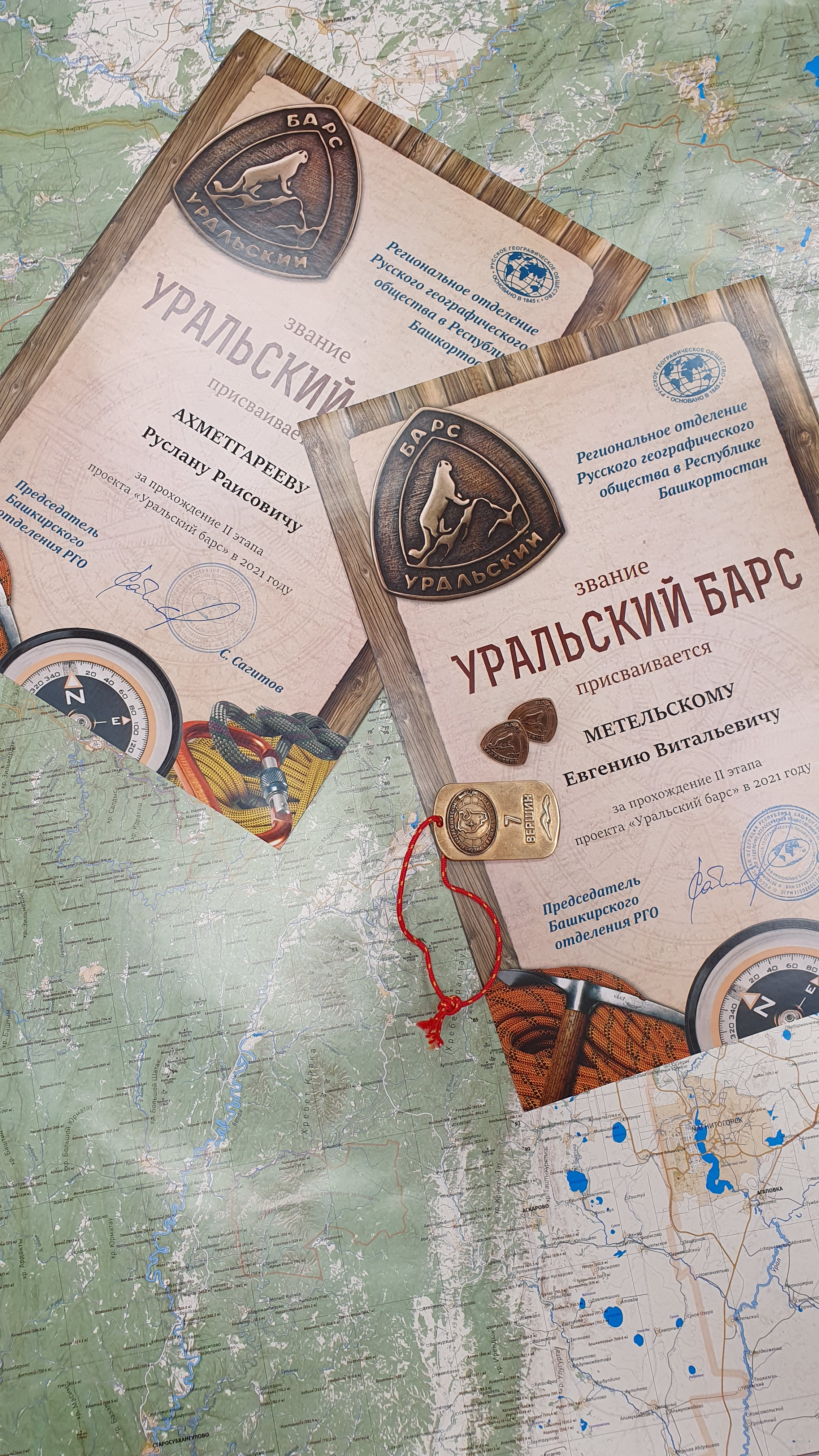 В 2020 году наши коллеги выполнили условия первого этапа проекта, совершив восхождения на горы-тысячники Южного Урала: Большой Иремель, Рассыпная, Ялангас, Большой Кумардак, Курташтау, Кушай, Масим. В итоге Региональное отделение Русского географического общества в Республике Башкортостан наградило их бронзовыми жетонами «7 вершин».